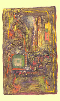 circuit board, the high tech heart of a PC. Acrylic collage on watercolor paper, 11"